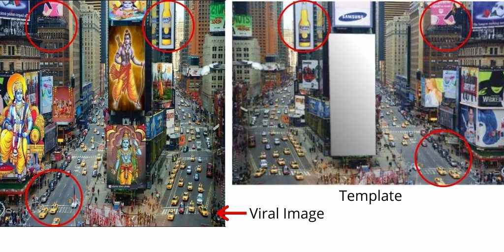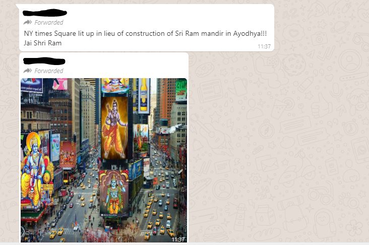 टाइम्स स्क्वायर, न्यूयॉर्क की टेम्पलेट पर बनाई गयी एक तस्वीर इस फ़र्ज़ी दावे के साथ वायरल है की अयोध्या में होने जा रहे राम मंदिर के भूमि पूजन, जो 5 अगस्त को है, के पहले न्यूयॉर्क में भगवान राम की तस्वीरें डिस्प्ले की गयी हैं |