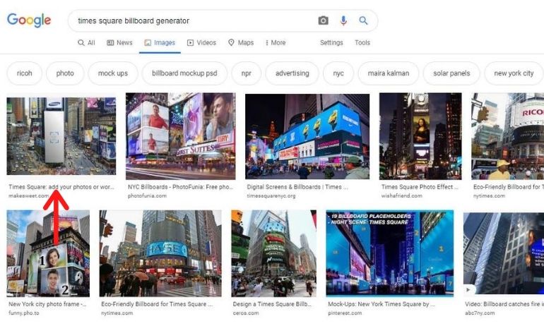 बूम ने फिर 'टाइम्स स्क्वायर बिलबोर्ड जनरेटर' कीवर्ड्स के साथ सर्च किया और वायरल हो रहा टेम्पलेट मेकस्वीट नामक वेबसाइट पर पाया | यह वेबसाइट तस्वीरें अलग अलग फ्रेम्स के साथ एडिट करने के लिए उपयोग की जाती है |