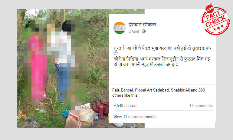 तस्वीर फ़ेसबुक पर इस दावे के साथ शेयर की जा रहा है कि यह परिवार सूरत से अपने घर की तरफ रवाना हो रहा था जहाँ परिवार ने भूख के कारण ख़ुदकुशी कर ली |