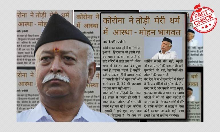 नहीं, आर एस एस प्रमुख मोहन भागवत ने नहीं कहा: "कोरोना ने तोड़ी मेरी धर्म में आस्था"
