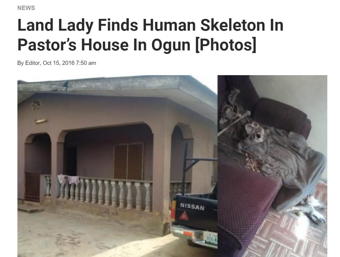 यह घटना नाइजीरियाई राज्य ओगुन में हुई जहां एक पादरी को मानव कंकाल के साथ पकड़ा गया, जो संभवतः एक महिला की थी। एक नाइजीरियाई वेबसाइट की रिपोर्ट के अनुसार, "घर कीमकान मालकिन ने पादरी के घर में एक साल तक किराया नहीं देने के कारण उसे बेदखल कर दिया। बाद में उनके घर के भीतर मानव कंकाल मिला।" पादरी ने कथित तौर पर अपनी बहन का कंकाल रखा था, जिसकी मौत शायद छह साल पहले हुई थी।