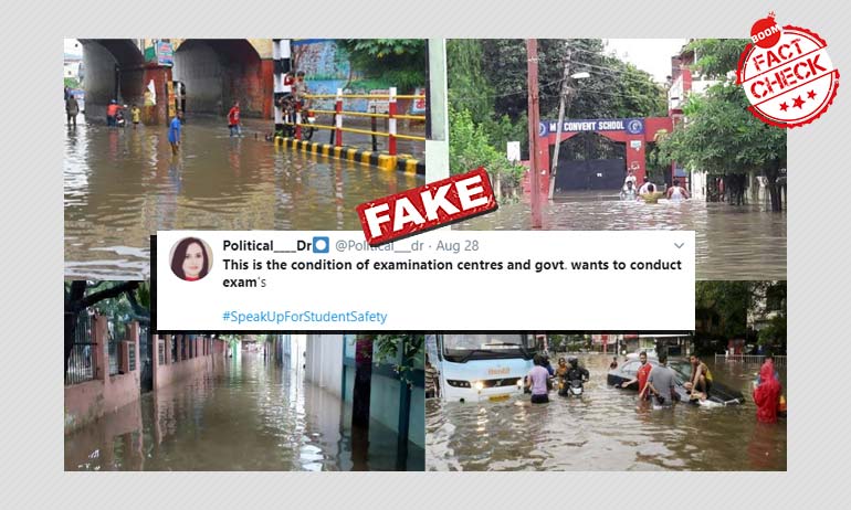 चार तस्वीरों का एक सेट ट्विटर पर वायरल हो रहा है | इसमें चार अलग अलग इलाके दिखाए गए हैं जिनमें लबालब पानी भरा हुआ है | दावा किया जा रहा है कि यह नीट और जेईई परीक्षा केन्द्रो की हालत है जहाँ सरकार परीक्षाएं करवाना चाहती है | यह दावे फ़र्ज़ी हैं क्योंकि तसवीरें पुरानी हैं |