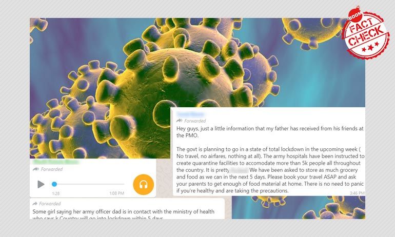 बूम यह पता लगाने में सक्षम था कि क्लिप में सुनाई देने वाली आवाज़ एक लड़की की है, जो दावा करती है कि उसके पिता, सशस्त्र बल में डॉक्टर हैं और उसके पिता ने ही पुष्टि की है कि अगले सप्ताह से देश लॉकडाउन में जाएगा। लड़की ने अपने पिता को क्वोट करते हुए बताया, "सभी सेना अस्पताल अब स्वास्थ्य मंत्रालय के सीधे संपर्क में हैं और अब उन्हें हर जगह क्वारिन्टीन सुविधाएं बनाने का आदेश दिया गया है।" लड़की का दावा है कि उसके पिता सेना के अस्पतालों में से एक के प्रभारी हैं, जिसका इस्तेमाल रोगियों को क्वारिन्टीन करने के लिए किया जाता है। लड़की अपने पिता को क्वोट करते हुए कहती है, "स्वास्थ्य मंत्रालय ने निर्देश दिया है कि देश अगले पांच दिनों में कम से कम एक महीने के लिए लॉकडाउन पर जा रहा है।"