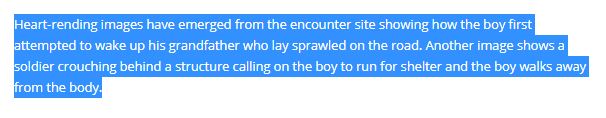 न्यूज़ रिपोर्ट्स के अनुसार 1 जुलाई 2020 को कश्मीर के सोपोर कस्बे में सीआरपीएफ़ और उग्रवादियों के बीच हुई मुठभेड़ में एक बुज़ुर्ग व्यक्ति की जान कथित तौर पर उग्रवादियों की गोली से हो गयी थी | बुज़ुर्ग के पोते की कई ह्रदय-विदारक तस्वीरों ने सोशल मीडिया पर भूचाल मचा दिया था |