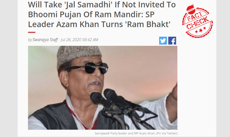 न्यूज़ वेबसाइट स्वराज्य और न्यूज़ पोर्टल न्यूज़ ट्रैक लाइव ने लेख प्रकाशित किये जिसमें लिखा की समाजवादी पार्टी के नेता आज़म खान ने कहा की वह जलसमाधि ले लेंगे यदि उन्हें 5 अगस्त 2020 को होने वाले राम मंदिर भूमि पूजन में नहीं बुलाया गया |