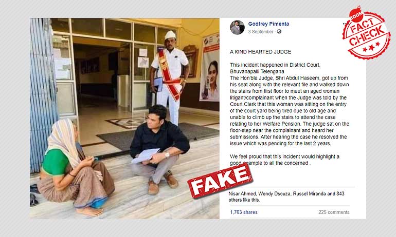 फ़ेसबुक पर तेलंगाना के जयशंकर भुपलपल्ली ज़िले के कलेक्टर मुहम्मद अब्दुल अज़ीम की एक वृद्ध महिला के साथ बैठे हुए तस्वीर फ़र्ज़ी दावों के साथ वायरल है | इस फ़ोटो के साथ दावा यह है की वह ज़िले के जज हैं और एक याचिकाकर्ता के पास बैठकर उन्होंने दो साल पुराने एक मामले को सुलझाया है |