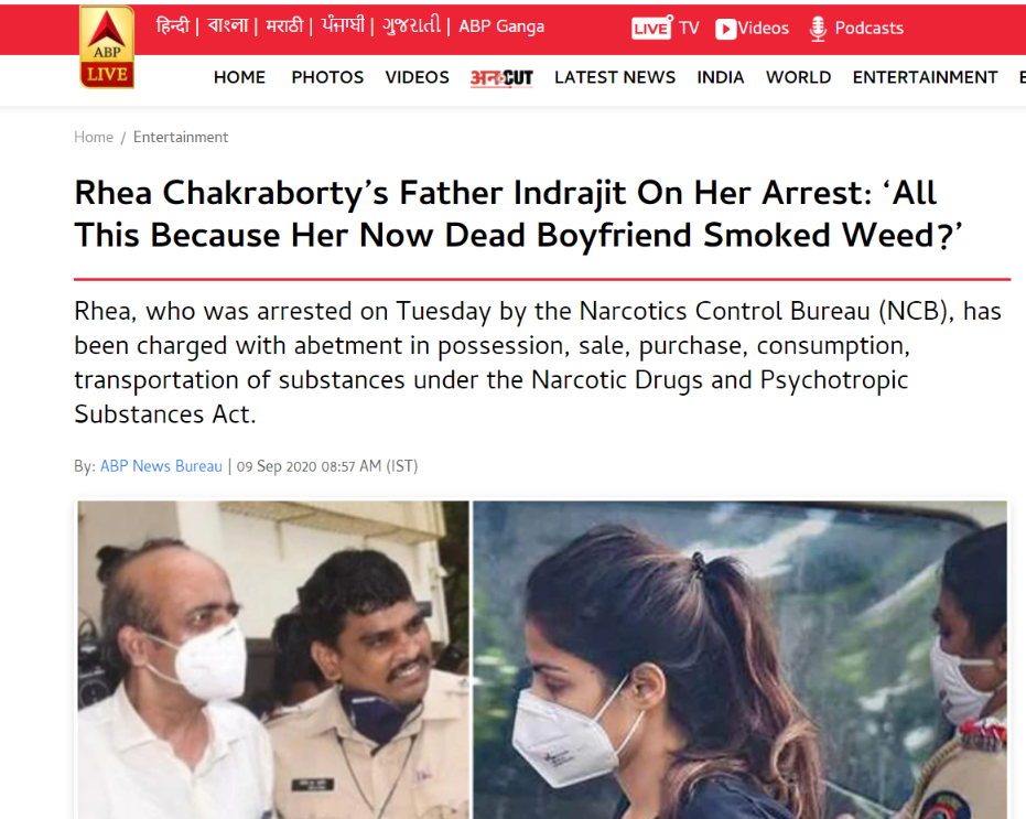 ए.बी.पी ने दो लेख प्रकाशित किये जो इस बहरूपिया हैंडल पर आधारित हैं | एक लेख की हैडिंग में लिखा: "रिया चक्रबर्ती के पिता उनकी गिरफ्तार के बाद: 'यह सब क्योंकि उसके मृत बॉयफ्रेंड ने गांजा पिया?'"