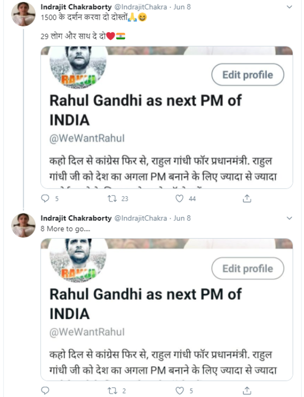 यही अकाउंट जिसका पिछले यूज़रनेम @WeWantRahul था, 8 जून को ट्वीट कर नेटिज़ेंस को अपने फोल्लोवेर्स 1,500 तक बढ़ाने को कहता है |