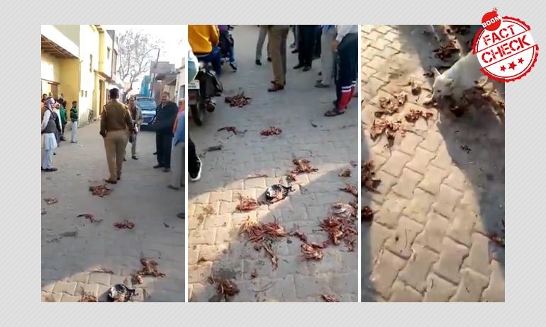 ट्वीटर और फेसबुक पर झूठे दावों के साथ 30 सेकेंड का क्लिप वायरल हो रहा है जिसमें आवारा कुत्तों को सड़क पर बिखरे कच्चे मांस के टुकड़ों को उठाते हुए दिखाया गया है, जबकि पास ही कुछ लोग और पुलिस अधिकारी खड़े हैं।