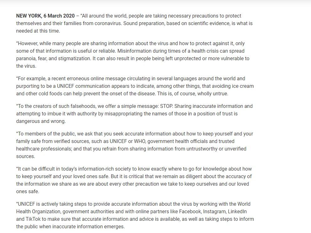 6 मार्च, 2020 को यूनिसेफ़ ने एक प्रेस रिलीज भी जारी की, जिसमें लोगों को सलाह दिया गया था कि वह मिलने वाली जानकारी को उल्लेख किए गए स्रोत के साथ क्रॉसचेक करें और सोशल मीडिया पर फैलाए जाने वाले किसी भी झूठी जानकारियों पर विश्वास ना करें।
