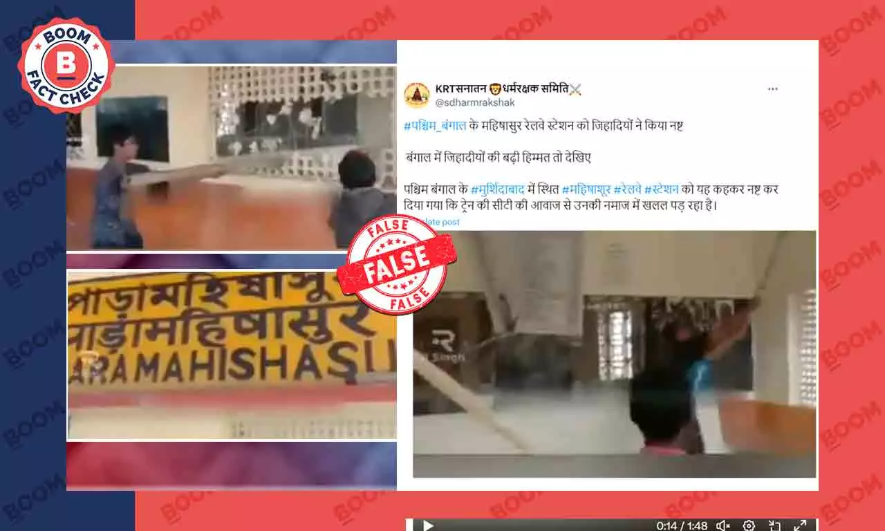 पश्चिम बंगाल में भीड़ द्वारा एक रेलवे स्टेशन में तोड़फोड़ किए जाने का वीडियो सोशल मीडिया पर वायरल (आर्काइव पोस्ट) है. यूजर्स वीडियो शेयर करते हुए सांप्रदायिक दावा कर रहे हैं कि पश्चिम बंगाल के मुर्शिदाबाद में मुसलमानों ने महिषासुर रेलवे स्टेशन में इसलिए तोड़फोड़ कर दी क्योंकि ट्रेन के हॉर्न की आवाज से उनकी नमाज में खलल पड़ता था.