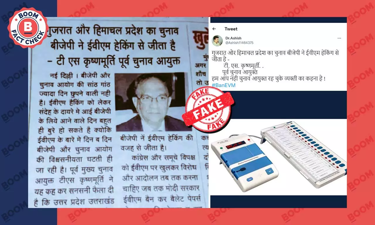 बूम ने अपनी जांच में पाया कि पूर्व चुनाव आयुक्त टीएस कृष्णमूर्ति के नाम से वायरल हो रहा बयान ग़लत है. पूर्व चुनाव आयुक्त ने गुजरात और हिमाचल प्रदेश में ईवीएम हैक करके बीजेपी के चुनाव जीतने का बयान नहीं दिया. बूम पहले भी वायरल अख़बार कटिंग में किये गए दावे का फ़ैक्ट चेक कर चुका है. तब, बूम ने पूर्व चुनाव आयुक्त टीएस कृष्णमूर्ति से संपर्क किया था, जिसमें उन्होंने अख़बार के इस दावे को बेबुनियाद बताते हुए इसका खंडन किया था. इस मामले पर उन्होंने चुनाव आयोग में अख़बार के ख़िलाफ़ शिकायत भी दर्ज करवाई थी. पूरी रिपोर्ट नीचे पढ़ें.