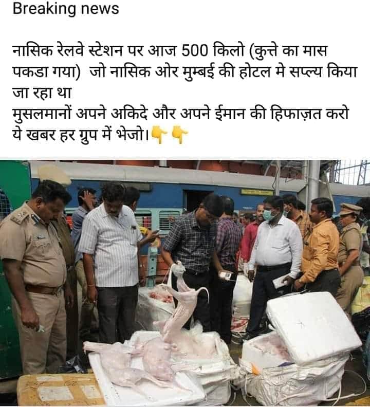 "Breaking news: नासिक रेलवे स्टेशन पर आज 500 किलो (कुत्ते का मांस पकड़ा गया जो नासिक ओर मुम्बई की होटल मे सप्ल्य किया जा रहा था । मुसलमानों अपने अकिदे और अपने ईमान की हिफाज़त करो । ये खबर हर ग्रुप में भेजो।"