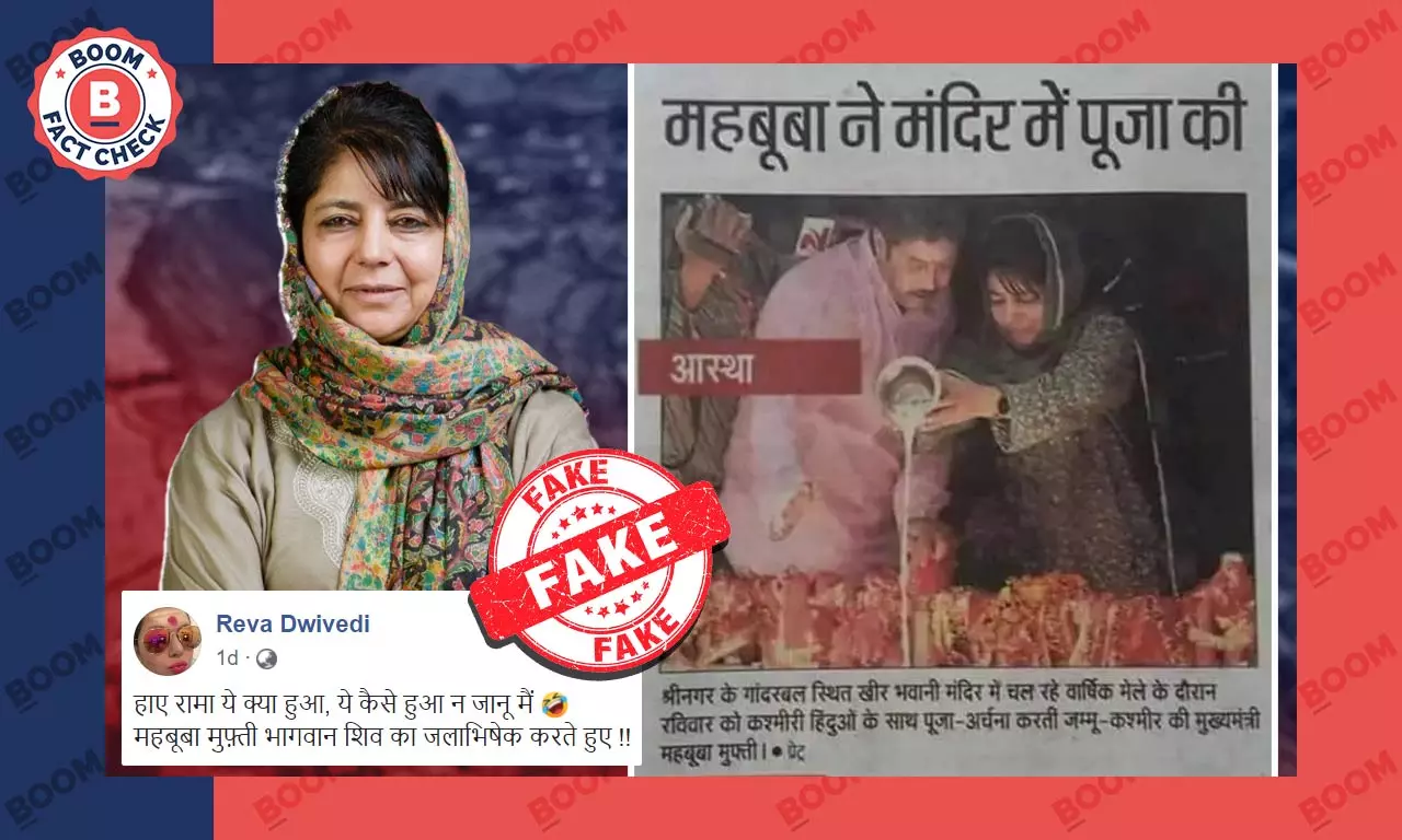 बूम ने पाया कि जम्मू कश्मीर की पूर्व मुख्यमंत्री और पीडीपी नेता महबूबा मुफ़्ती की यह वायरल तस्वीर हाल के दिनों की नहीं बल्कि साल 2016 की है. हमने पाया कि अख़बार कटिंग में तस्वीर के नीचे स्पष्ट शब्दों में महबूबा मुफ़्ती को जम्मू-कश्मीर का मुख्यमंत्री बताया गया है. जबकि वो जून 2018 तक ही मुख्यमंत्री के पद पर थीं. हमारी जांच में सामने आया कि वायरल तस्वीर जून 2016 की है जब तत्कालीन मुख्यमंत्री महबूबा मुफ़्ती ने श्रीनगर के गांदरबल में खीर भवानी मंदिर में चल रहे वार्षिक मेले के दौरान कश्मीरी पंडितों के साथ पूजा की थी. बूम पहले भी इस तस्वीर के साथ किये गए दावे का फ़ैक्ट चेक कर चुका है. पूरी रिपोर्ट पढ़ें