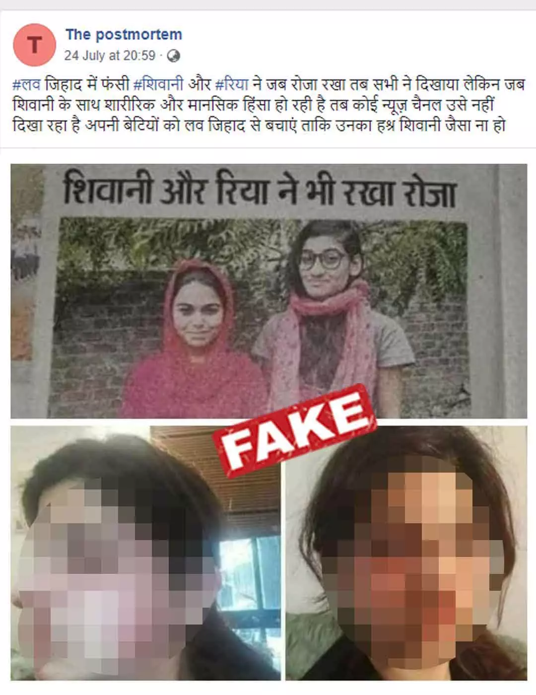 "#लव जिहाद में फंसी #शिवानी और #रिया ने जब रोजा रखा तब सभी ने दिखाया लेकिन जब शिवानी के साथ शारीरिक और मानसिक हिंसा हो रही है तब कोई न्यूज़ चैनल उसे नहीं दिखा रहा है अपनी बेटियों को लव जिहाद से बचाएं ताकि उनका हश्र शिवानी जैसा ना हो" (Sic)
