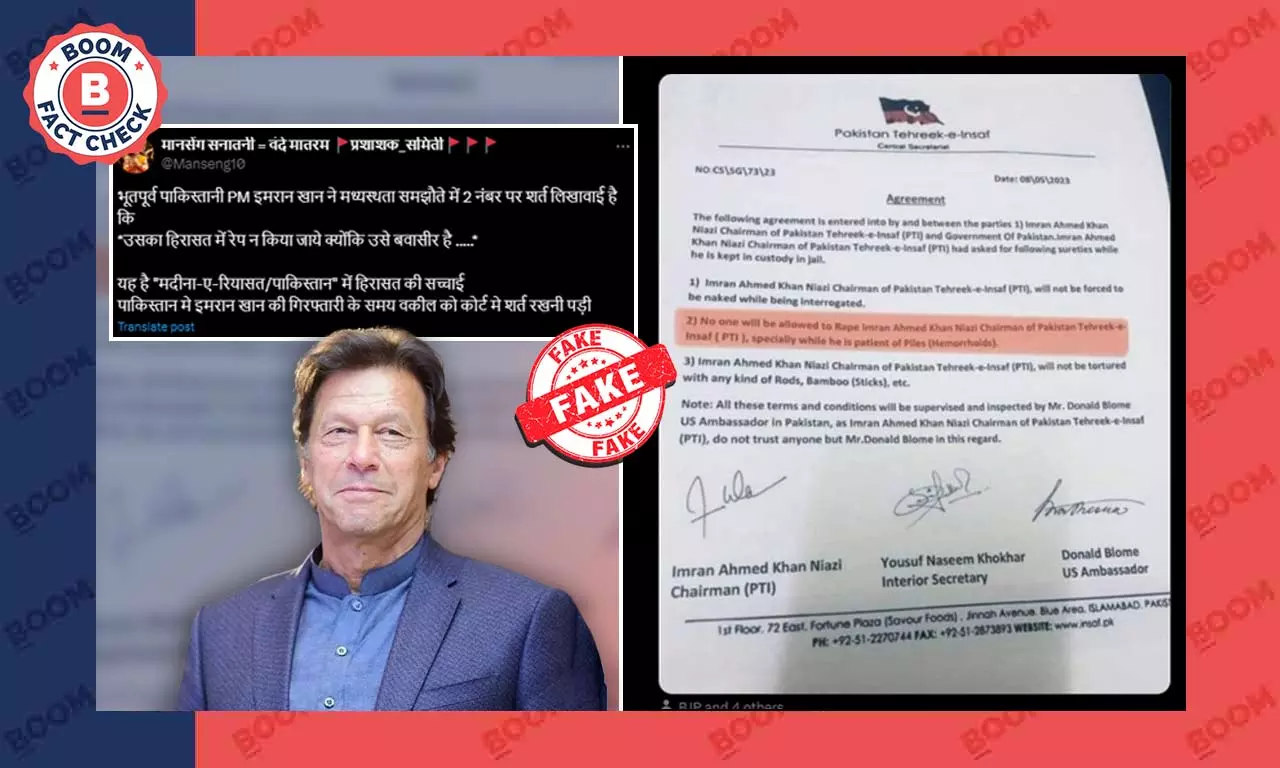सोशल मीडिया यूजर्स पत्र शेयर करते हुए लिख रहे हैं कि मध्यस्थता समझौते में एक शर्त यह भी लिखवाई गई थी कि इमरान खान का हिरासत के दौरान रेप न किया जाये क्योंकि उन्हें बवासीर है.