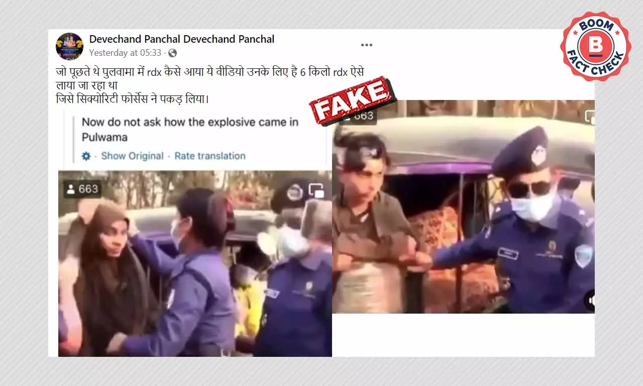 फ़ेसबुक पर एक वीडियो को शेयर कर दावा किया जा रहा है कि वो पुलवामा में एक व्यक्ति को विस्फोटक पदार्थ की तस्करी करते हुए दिखाता है. वीडियो में सुरक्षाकर्मी एक बुर्का पहने हुए व्यक्ति को पकड़ते हैं जिसने कपड़े के अंदर कुछ छिपा रखा था. इस वीडियो को सोशल मीडिया पर इसी दावे के साथ ख़ूब शेयर किया गया है. बूम ने पहले भी इस वीडियो का फ़ैक्ट चेक किया है. बूम ने पाया था कि ये वीडियो भारत का नहीं बल्कि बांग्लादेश का है जहां सुरक्षाकर्मियों ने बुर्के के अंदर छिपाकर नशीले पदार्थ की तस्करी करते एक व्यक्ति को पकड़ा था. खबरों के मुताबिक़ पुलिस को तस्करी की सूचना मिली थी जिसके बाद आरोपी व्यक्ति को एक अन्य महिला के साथ नशीले पदार्थ के चिटगाँव इलाक़े से साथ पकड़ा गया था. पुलिस के मुताबिक़ वह व्यक्ति बुर्का पहनकर एक गर्भवती महिला के भेष में था.