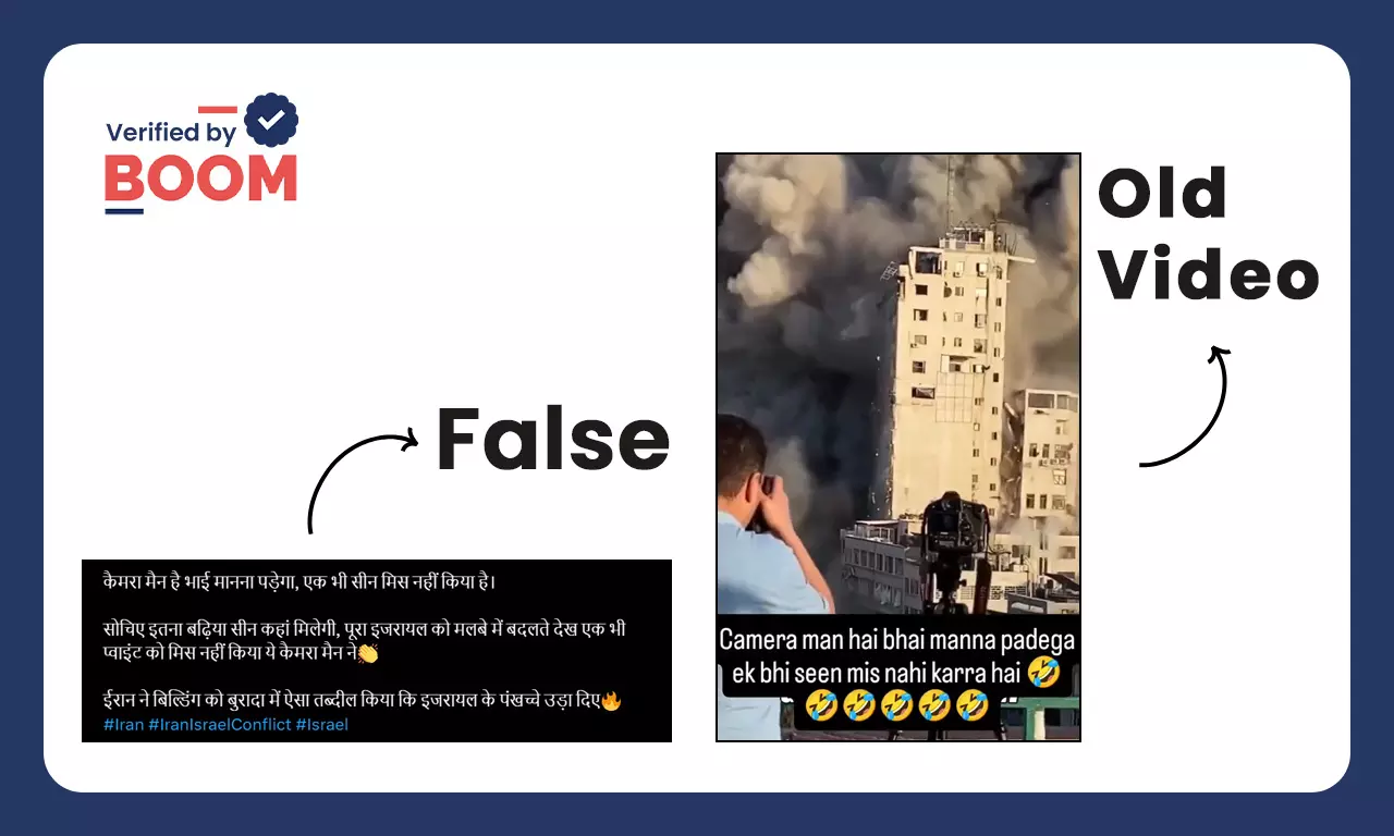 बूम ने जांच में पाया कि वीडियो पुराना है और गाजा से है. 2021 में इजरायल ने गाजा पर हमला किया था जिसमें अल शोरूक टॉवर ध्वस्त हो गया था.