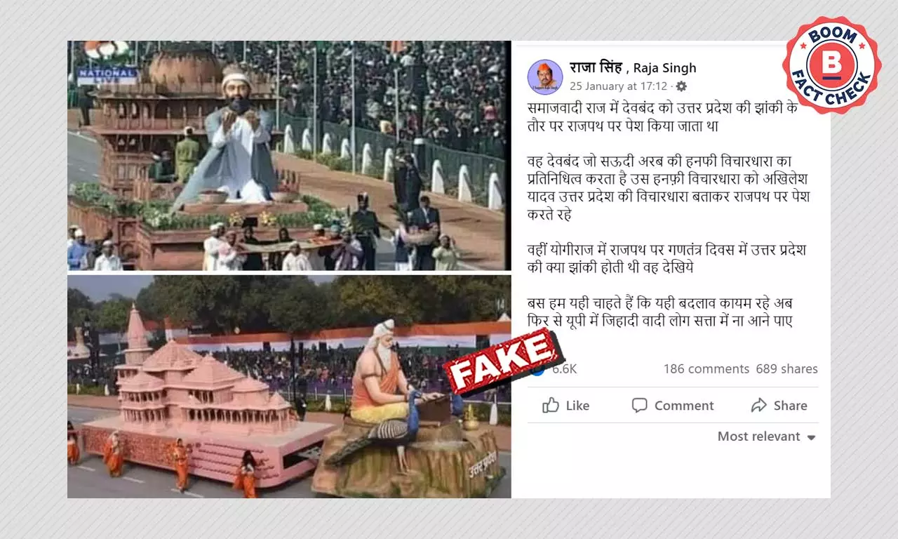 दो तस्वीरों के कोलाज के साथ किया गया दावा ग़लत है. बूम ने पाया कि कोलाज में दूसरी तस्वीर जिसमें राम मंदिर की झांकी दिख रही है, वो पिछले साल यानी 2021 की है. उत्तर प्रदेश की झांकी में निर्माणाधीन राम मंदिर का ढांचा दर्शाया गया था. जबकि नमाज़ अदा करने की मुद्रा में बैठे व्यक्ति की पहली तस्वीर असल में 2011 के गणतंत्र दिवस के अवसर पर निकाली गई बिहार की झांकी है. बूम पहले भी इन दोनों तस्वीरों का फ़ैक्ट चेक कर चुका है. पूरी रिपोर्ट नीचे पढ़ें.